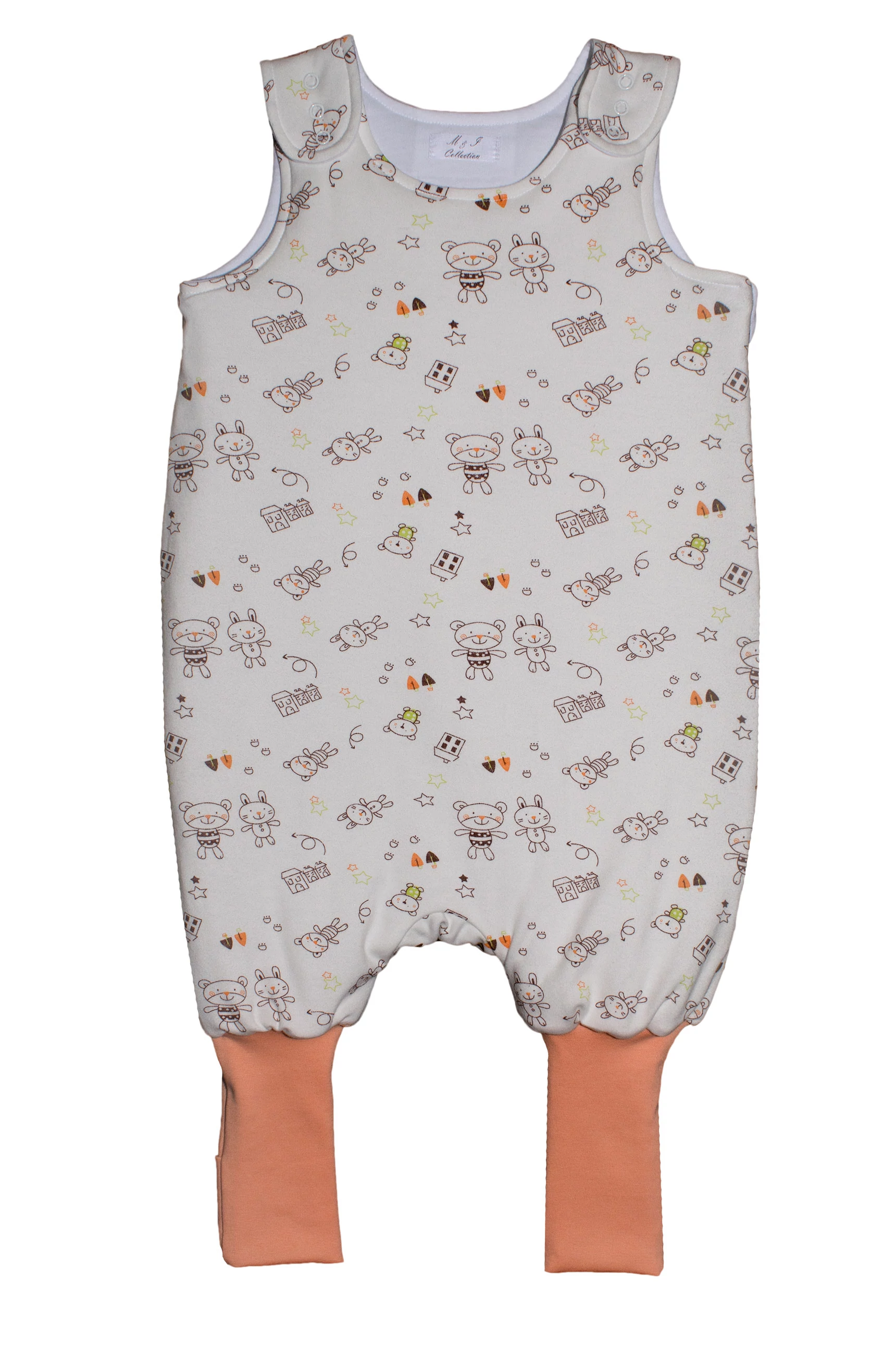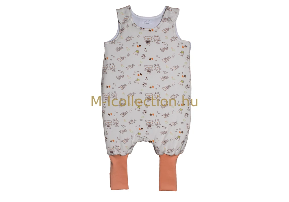 Halvány sárga alapon, kis macis mintás pamut téli bélelt lány tipegő hálózsák, járni tudó babák számára kamáslival.